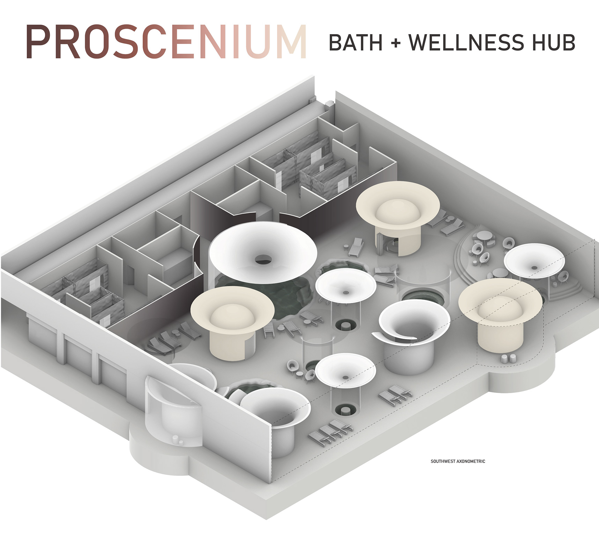 Informed by historical precedents such as the Greco-Roman thermal bathes, this proposal interrogates the bathhouse as a manufactured microcosm of nature, one that reproduces climactic conditions (i.e. humidity, thermal variations) on a smaller, interior scale. Initially an exploration of how certain manufactured and natural elements might amplify each other in this environment, Proscenium Bath and Wellness emerges as an interim space where water, light, and material interact to challenge a spectator’s perception and provide an engaging brand of rejuvenation.